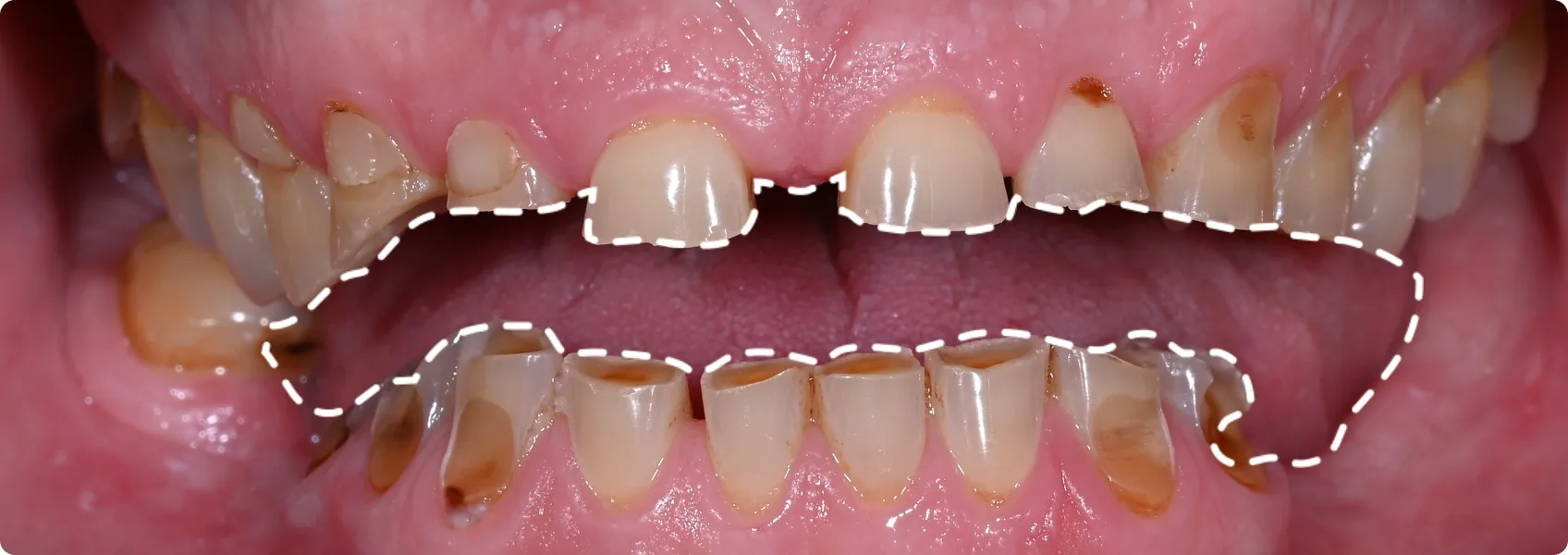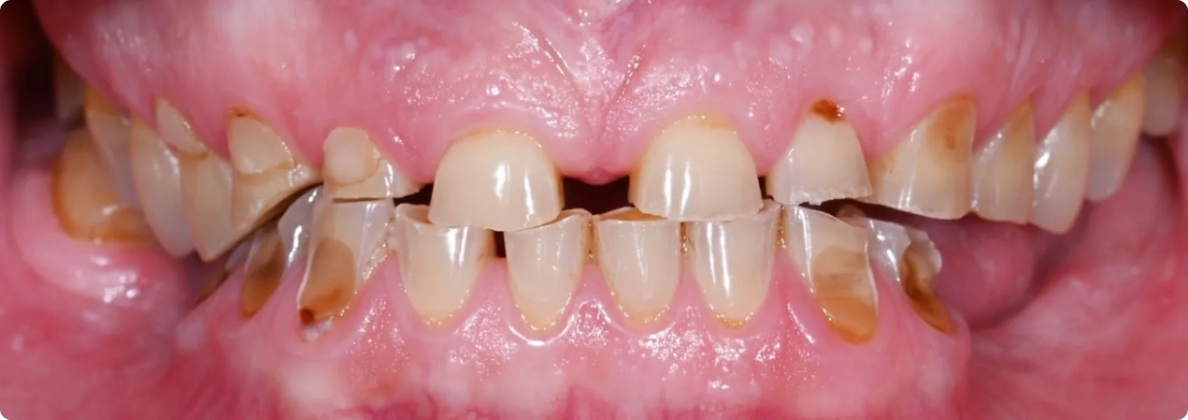 Zęby były nie tylko bardzo mocno starte, ale brakowało też wielu z nich w dolnym łuku. Relacja między górnymi a dolnymi zębami była tak zaburzona, że Pacjent de facto nie posiadał prawidłowego zgryzu!
