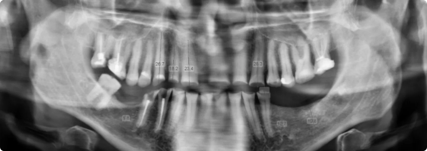 RTG pozwala zajrzeć „pod powierzchnię” – zobaczyć korzenie zębów, kość wyrostka zębodołowego, stan tkanek wokół korzeni, a także wewnętrzną budowę zębów (np. komorę miazgi, kanały korzeniowe).
