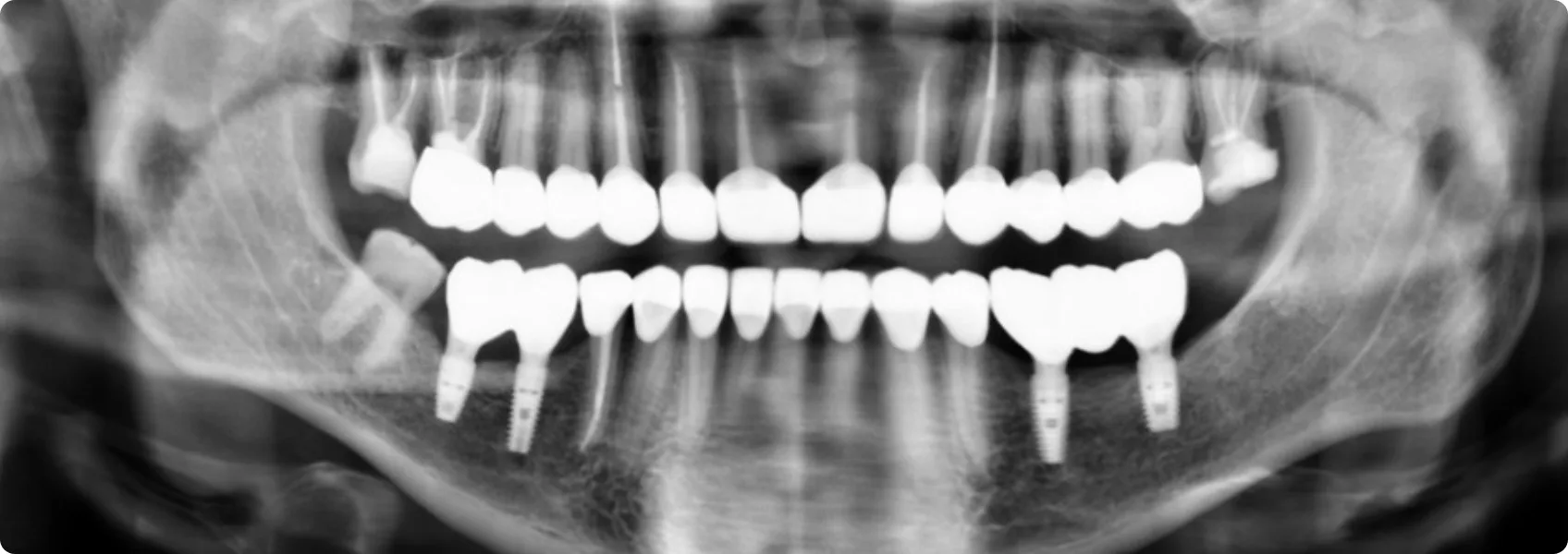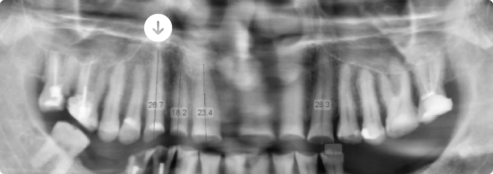 RTG pokazało, że filary zębów własnych Pacjenta — te, na których miała opierać się przyszła rekonstrukcja — były zbyt krótkie.